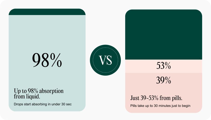 Liquid drops absorb faster and more effectively than powders or pills - no mixing, no waiting, no heavy digestion. Just clean, direct delivery of active ingredients when your brain needs them most.