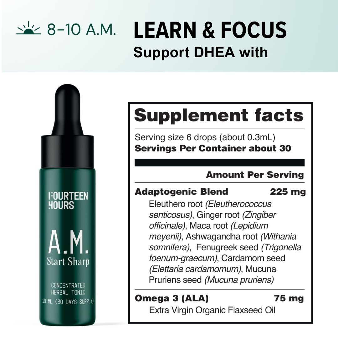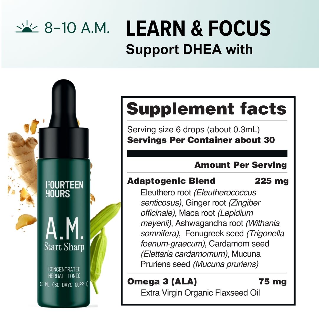 Get into flow, stay engaged, and handle whatever the day brings. This is when your brain naturally peaks in DHEA — the hormone these adaptogens need to work.