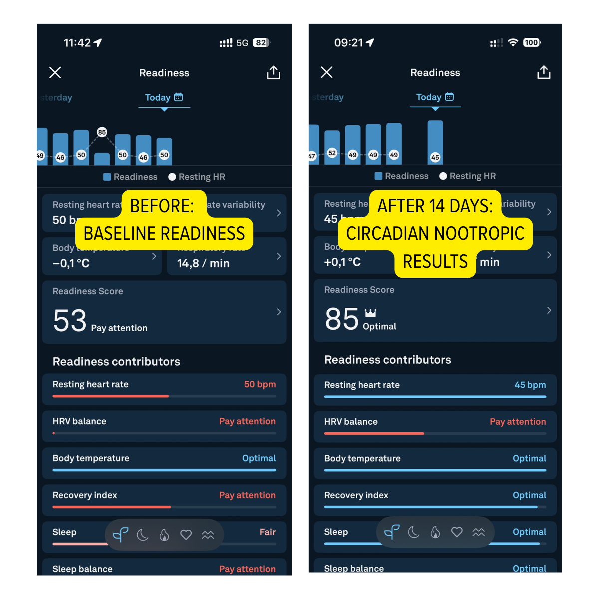 What you’ll notice: Higher morning readiness, fewer “low-HRV” days, steady focus without caffeine. (Readiness Score ↑ through smoother HRV transition and faster Recovery Index normalization.)