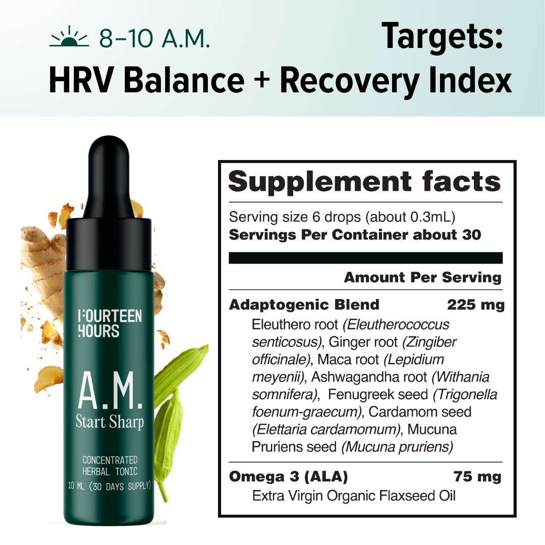 How it works: Your morning HRV and resting heart rate reflect how quickly your body switches from recovery to performance mode. AM blend primes this transition — gently activating the nervous system while maintaining balance.