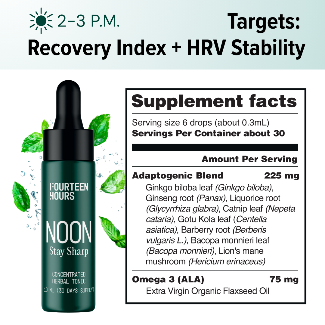 How it works: By midday, your HRV naturally dips and cognitive fatigue builds up from glutamate accumulation. The NOON formula restores neurochemical balance and supports steady performance through the day.