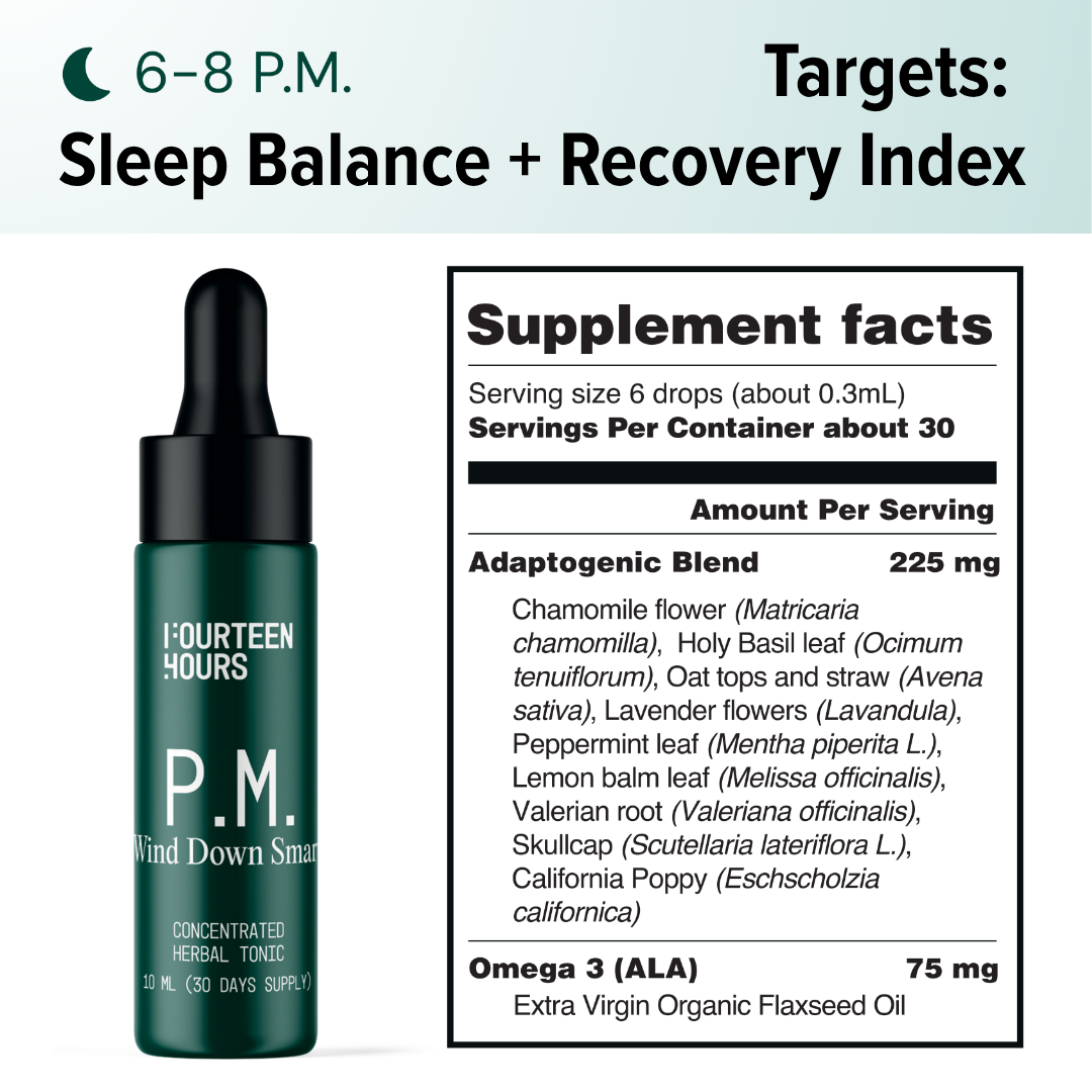 How it works: Nighttime Readiness depends on your ability to shift from alertness to recovery. The PM blend promotes parasympathetic dominance — the foundation of deep sleep and next-day readiness.